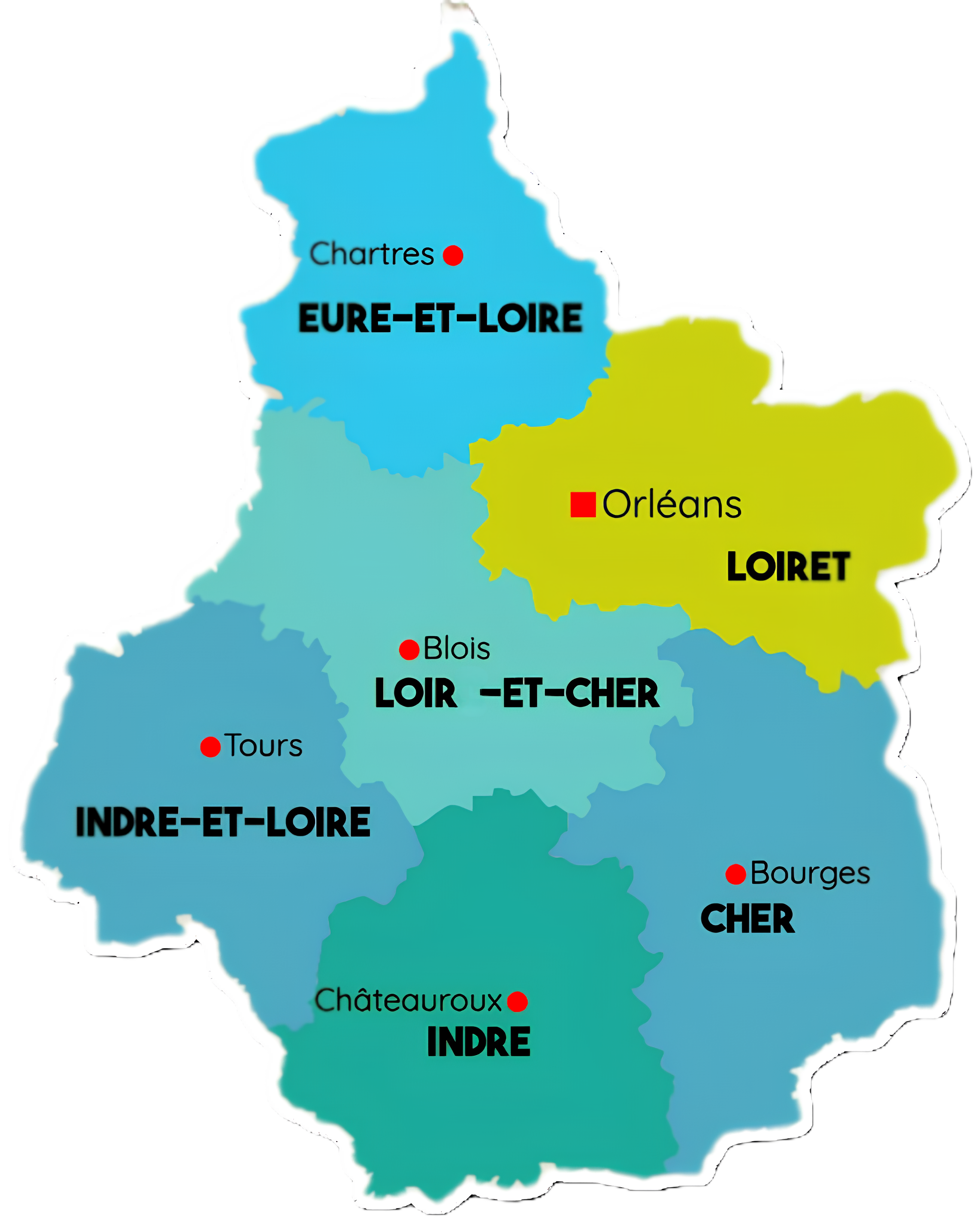 Soit un total de 185 cantons et 1842 communes pour une superficie de 39.151 km². Elle a pour capitale, ORLÉANS, également chef-lieu du Loiret et pour chefs-lieux de départements, les villes de BLOIS (Loir-et-Cher), BOURGES (Cher), CHARTRES (Eure-et-Loir), CHATEAUROUX (Indre) et TOURS (Indre-et-Loire).